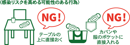 テーブルに直接置いたり、カバンや服のポケットに入れてしまいがちですが、マスクに付着していたウイルスを広めてしまう可能性があります。
