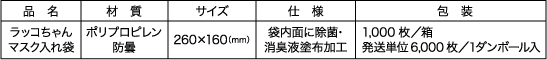袋外側には、マスクの持ち主名などを記入できるスペースや、お客様へ向けたメッセージ、この袋の簡単な説明などが印刷されております。